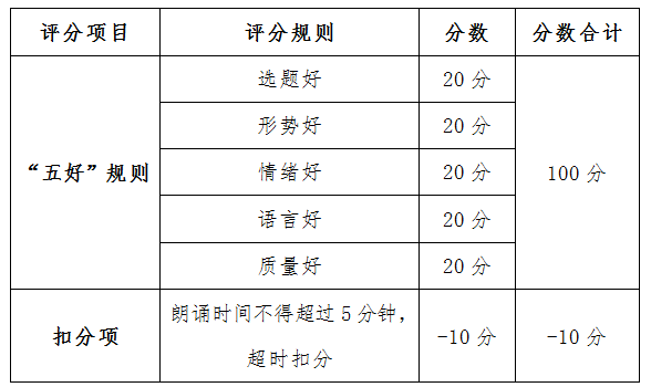 1、内容题材不限,诵读时间不超过5分钟。诵读方式为两人及以上诵读,参加决赛的可伴奏或伴舞(自行准备伴奏乐器和服装)。