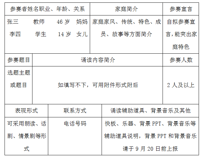 1、以家庭为单位,征集热爱阅读、喜爱表演的朗读者,如有独特经历,能讲出故事的更佳,可以是夫妻联袂、可以是父子、母子、爷孙、情侣等等两人以上的家庭成员。