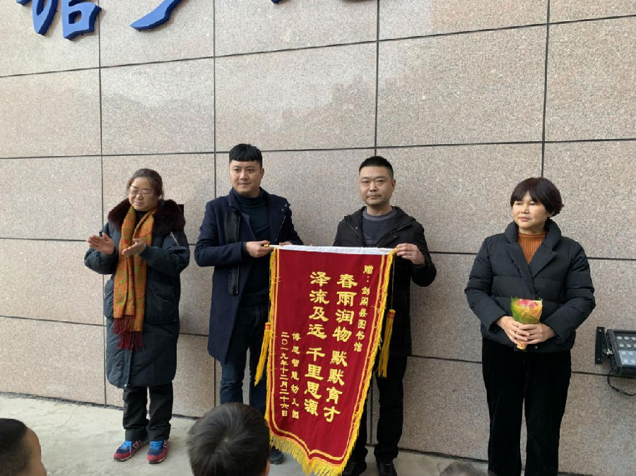 12月26日,剑阁县图书馆收到博思慧智幼儿园送来的一面“春雨润物 默默育才 泽流及远 千里思源”锦旗。以此向勤恳服务的剑阁县图书馆工作人员表达感谢,并让孩子们在行动中学会感恩。