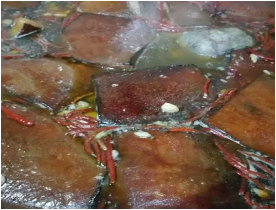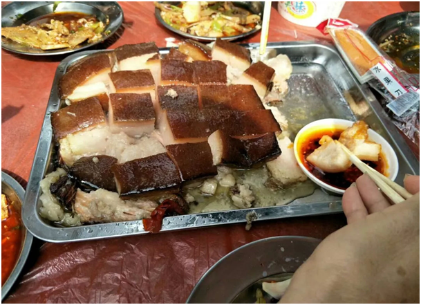 据介绍,“大肉”要用“五花肉”制成,每块三斤多重,在头一天就要下锅,加五味调料,慢火焖炖,约18小时后,才能“五味皆入,油腻自出,皮不烂,肉不流”,每桌放一小刀,切成8份,人均一块,入口“酥如豆腐”,不嚼即化。